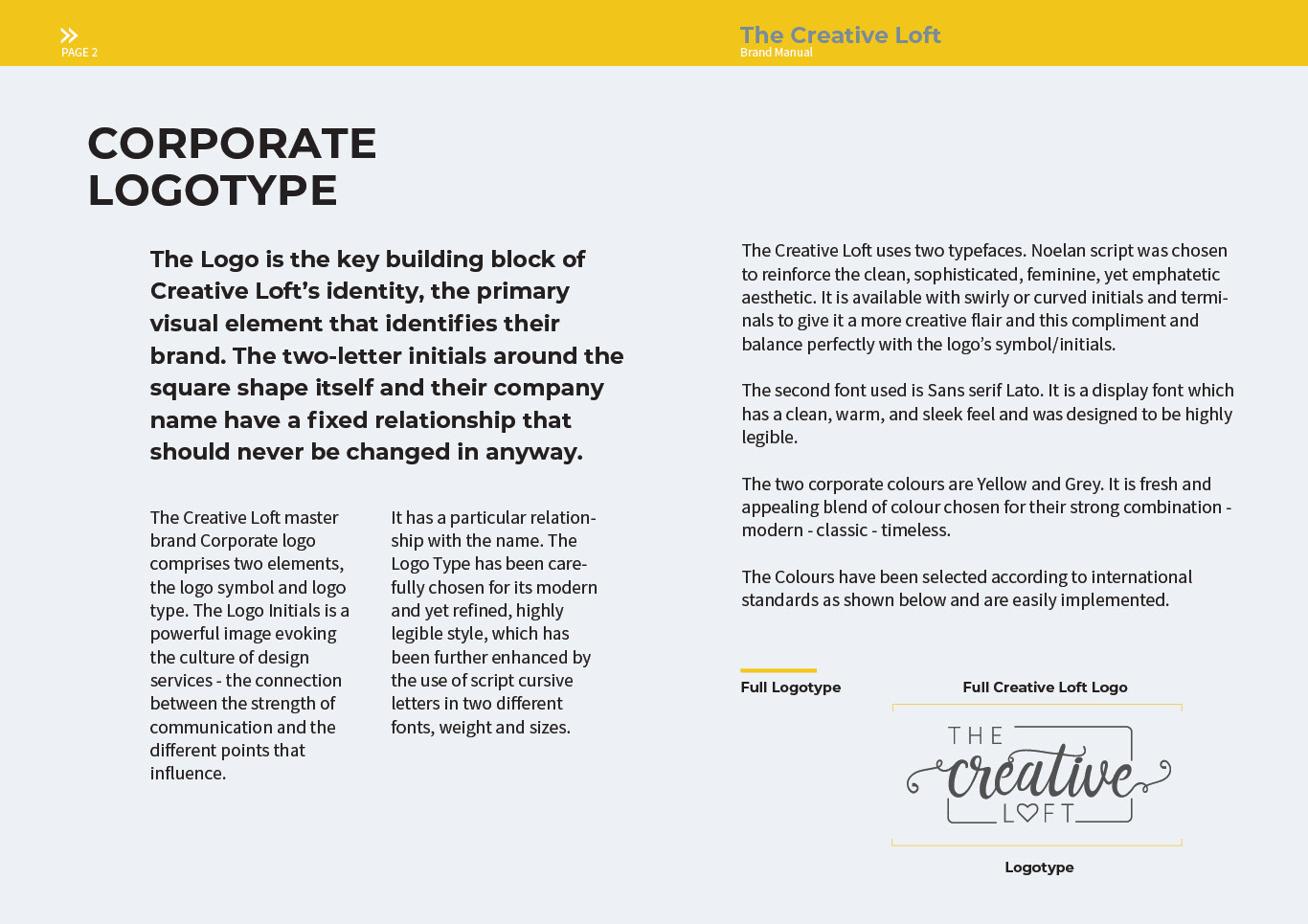 Here's a shorter version brand style guide manual for Creative Loft, spanning 10 pages (excluding the cover and back pages). Additionally, there's a more comprehensive 48-page brand style guide in a side-by-side PDF format button below. Click each image to enlarge viewing.